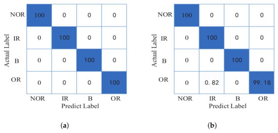 The confusion matrix of CNN in CWRU data set. (a) The highest classification result. (b) The lowest classification result.