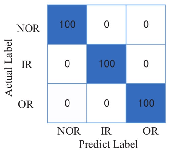 A total of 100 samples were collected under each working condition, for a total of 300. The data set division is the same as experiment 1, and the train set and test set account for and of the total number, respectively. A total of ten rounds of experiments were conducted, and each round was run for 100 epochs. The purpose of this practice is to avoid biased results due to special training and test sets. In ten rounds of experiments, the CNN classification accuracy under this data set has reached , and the classification results do not have obvious fluctuations for different test sets. Its confusion matrix is shown in Figure 10.