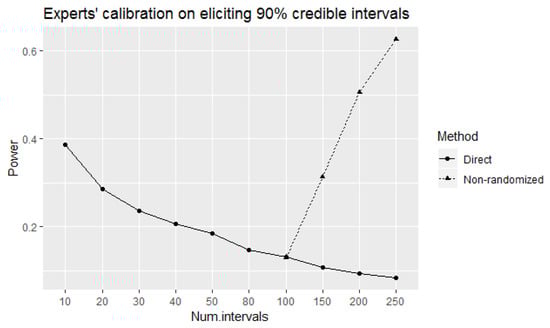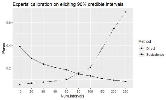 Using these choices for n and the corresponding rejection regions we calculated and plotted (in Figure 1) the power of the direct and equivalence tests to correctly identify well-calibrated experts at true level of coverage of experts’ elicited intervals. The observed values of power of the direct test tend to decrease as the number of elicited intervals increases. This is a counter-intuitive result from a statistical point of view as the power of a test would ordinarily be expected to increase with increased number of samples. However, the probability of observing a single element decreases as the number of elements of a sample space increases. This is the reason behind decreased power when the number of elicited intervals is increased. On the other hand, the power of the equivalence test increases (as intuitively expected) with the increase in the number of elicited intervals. The power of the equivalence test is higher than the corresponding power of the direct test for 80 or more intervals.