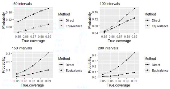 We shall further investigate the properties of the direct and equivalence tests when testing experts’ calibration on eliciting credible intervals when the true levels of coverage are different than . This is interesting both from a theoretical point of view, as well as from a practical perspective, as it is often claimed (sometimes with proof offered) that experts are either over- or under-confident. Here, we assess the outcomes of the direct and equivalence tests when testing calibration, when eliciting credible intervals at smaller true levels of coverage. This corresponds to the situation when experts’ assessments are overconfident. Figure 2 shows the probabilities of identifying the experts as well-calibrated when the true levels of coverage are between and . The comparison between the tests is presented for different choices for the number of elicited intervals. Even though larger variations from true coverage may occur in practice, here we only investigate a 0.05 deviation from true coverage probabilities. The reason behind this choice is the intention to expose a potential problem of the equivalence test to produce higher probabilities of incorrectly identifying experts as well-calibrated compared to the direct test.