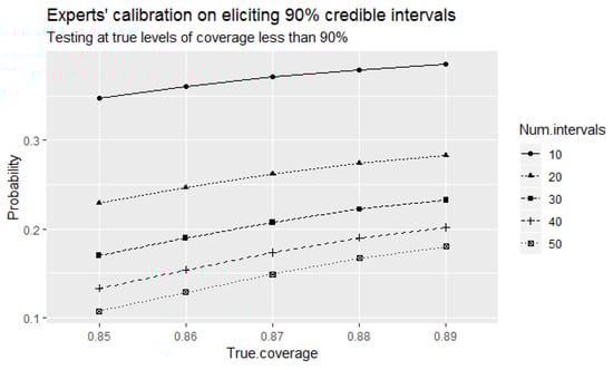 As discussed above, comparatively higher values of power to correctly identify well-calibrated experts at true level of coverage of elicited intervals can be obtained using the equivalence test compared to the direct test for 80 or more intervals. A trade-off seems to be that this is achieved at the expense of receiving comparatively higher probabilities of incorrectly identifying the experts as well-calibrated at true levels of coverage remain between 85% and 89% from the test (see Figure 2). Furthermore, these probabilities increase with the increase of number of elicited intervals. The alternative hypothesis of the equivalence test to declare equivalence (that is, to declare an expert as well-calibrated) at coverage probability with the acceptable margin of deviation around the reference value contains values between to (refer the Section 2.2 for details). Therefore, from the equivalence test point of view, the probabilities of identifying experts as well-calibrated at different true levels of coverage of elicited intervals within this range can be considered as the values of power (the probabilities of rejecting the null hypotheses when they are false) of the test at corresponding values in the rejection region of the test. Therefore, receiving comparatively higher probabilities of incorrectly identifying the experts as well-calibrated at true levels of coverage remain between 85% and 89% here happens due to a characteristic of the equivalence test.