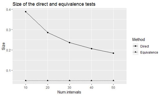 Figure 4 compares the size of the direct and equivalence tests at small number of elicited intervals. Observe that the size of the direct test decreases with the increase of number of elicited intervals. Therefore, if we apply the direct test to test experts’ calibration with small number of elicited intervals, the power of the test to correctly identify well-calibrated experts will not be sufficiently large. However, the size of the test which is equal to the value of the power should be considered as large from a statistical point of view. The equivalence test has lower values of power for the considered small number of elicited intervals with the fixed size of 0.05. If we increase the number of elicited intervals, the power of the equivalence test will be increased accordingly with the fixed size of 0.05. Therefore, the trade-off between the number of elicited intervals, power, and the size of the test is an important consideration in this context.