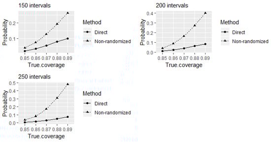 Figure 6 indicates the probabilities of the direct and non-randomized equivalence tests to identify the experts as 90% well-calibrated when true levels of coverage of elicited intervals that are less than 90% for large number of elicited intervals. The type I error probabilities of incorrectly identifying the experts as 90% well-calibrated at 85% true level of coverage of elicited intervals of the non-randomized test are less than 0.05 for the considered number of elicited intervals. It implies that the significance level of the non-randomized test is less than the nominal value 0.05. Therefore, the test is conservative with reduced power of rejecting the null hypotheses when they are false.