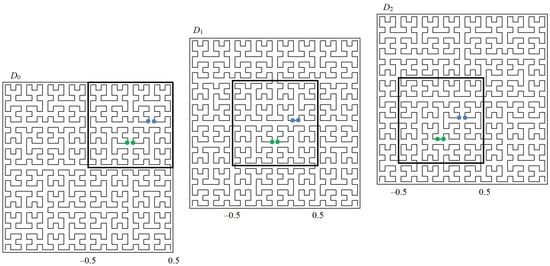 As an illustration, Figure 2 shows a family of space-filling curves in extended domains , where a square with a dark border highlights the hypercube D belonging to each extended domain. The dots indicate proximate objects in the domain D, the distance between which will vary depending on the one-dimensional scale used. The effect of maintaining distance proximity on one of the scales is clearly visible. For example, objects marked with green dots will be far away on the first two one-dimensional scales and close to each other on the third one. Objects marked in blue will be far away on the first and third scales and close to each other on the second scale.