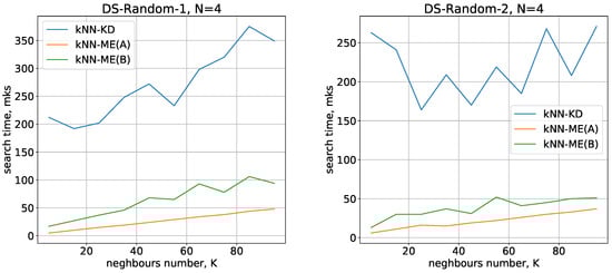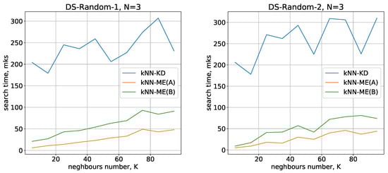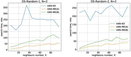 The running times used by the different methods (kNN-ME, procedure A, kNN-ME, procedure B, kNN-KD) for DS-Random-1 and DS-Random-2 datasets with are shown in Figure 3. The abscissa axis represents the number of nearest neighbours that the algorithm is searching for; the ordinate axis represents the running time of the method.