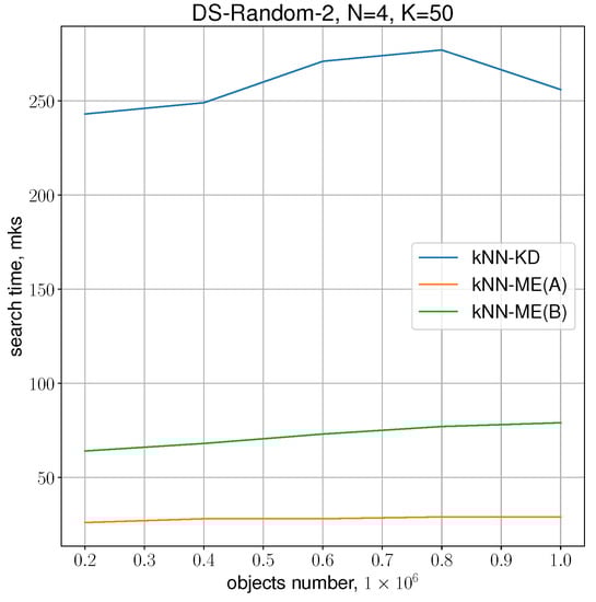 The following experiment was conducted to determine the dependence of the search time for neighbours with increasing number of samples for the chosen dimensionality . The number of samples was varied from 200 thousand to 1 million. The results presented in Figure 6 show that the difference between procedure A and procedure B remains approximately the same, and the gain of procedure A over the kNN-KD method is about 10 times.