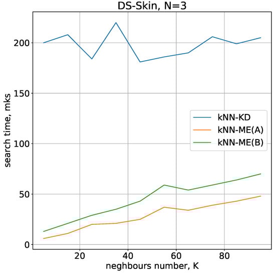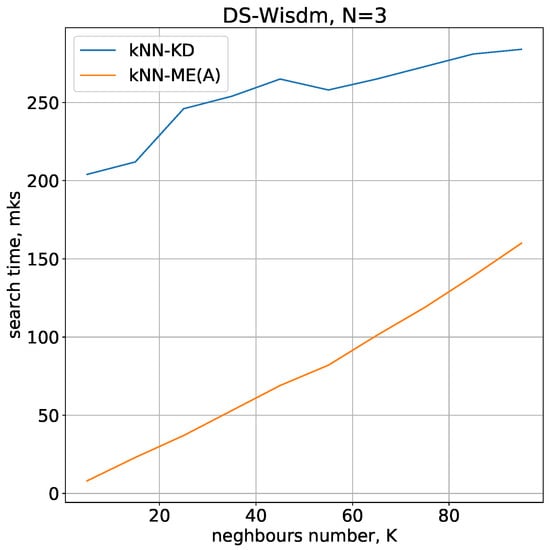 It is of interest to study the dependence of the nearest-neighbour search time on the number of such neighbours in the case of a large number of objects. For this study, we chose the DS-WISDM dataset []. The raw accelerometer and gyroscope sensor data was collected from the smartphone and smartwatch at a rate of 20 Hz; it was collected from 51 test subjects as they performed 18 activities for 3 min apiece. The raw accelerometer and gyroscope sensor data were collected from a smartphone and a smartwatch at a rate of 20 Hz; it was collected from 51 test subjects as they performed 18 activities for 3 min apiece. Traditional use of this dataset involves raw data processing, which includes splitting the data into blocks of fixed size and calculating statistical characteristics for each block. Subsequently, each block is treated as an independent object with a set of inherent characteristics determining the subject’s activity during a given time interval. After such processing, the number of blocks will be substantially smaller than the original number of objects.