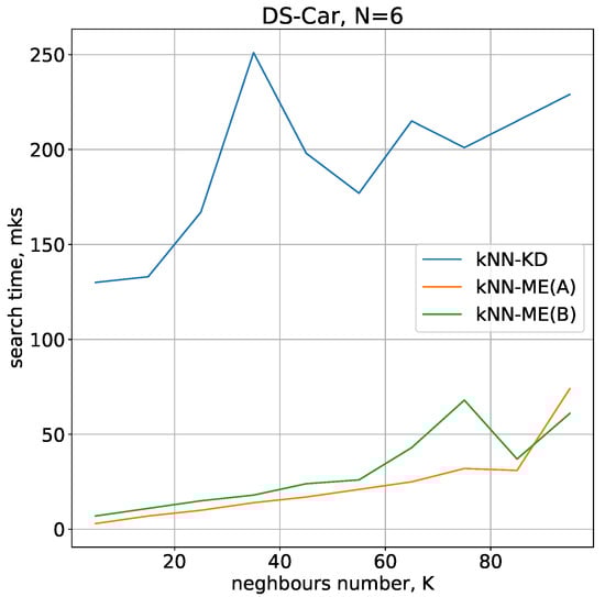The time required to find K nearest neighbours on the CarEvoluation dataset is shown in Figure 8. In this experiment, the number of evolvents used simultaneously was 7.