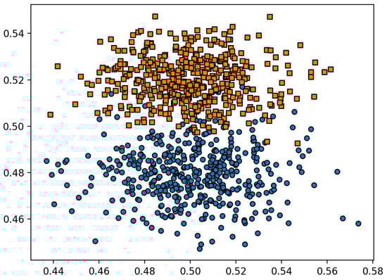 Unfortunately, determining the class of the test object is prone to error. Errors may occur because of the “location” of the object under test on the hypercube edge in immediate proximity to objects of another class. Figure 10 shows an example of a random test set where some objects of one class are surrounded by objects of an “alien” class.