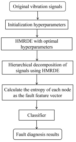 Notably, is generated by k operations of filtering smooth and is acquired through k calculations of mean change deviation of adjacent sample values. equals sample entropy at scale in multi-scale analysis. Based on HMRDE, the proposed fault diagnosis scheme for rolling bearings is given in Figure 3. The specific steps for the proposed scheme are given as follows.