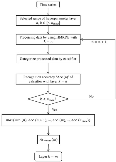 Step 3: Select optimal hyperparameters of HMRDE. In the training stage, the hyperparameters are adjusted, and the same classifier is used to test the effectiveness of different parameter setting methods. Select the HMRDE parameter setting with the best feature extraction effect. Under this parameter setting, the data processed by HMRDE has better distinguishability, and the same classifier can achieve higher classification accuracy. The flowchart of hyperparameter optimization of layer k is shown in Figure 4. Assume that the optimal hyperparameter layer k is m.