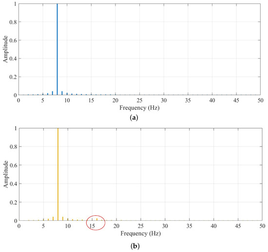 The frequency spectrum of time series under two health conditions. (a) Frequency spectrum of ; (b) Frequency spectrum of .