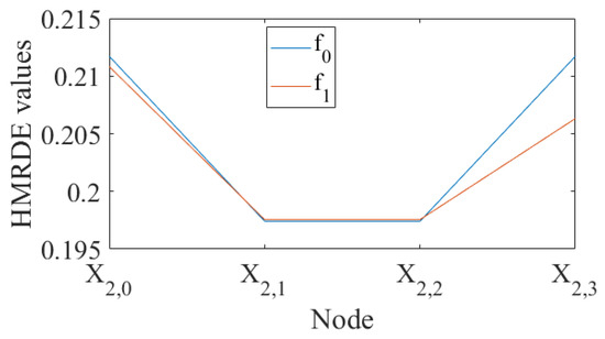 The node entropy values of time series under two health conditions are depicted in Figure 7, and these node entropy values are calculated by HMRDE, where layer k is 2, embedding dimension m is 3, time delay is 1, scale factor s is 1, and class number c is 5. In Figure 7, the entropy value of of is lower than that of , which is easily distinguished. The disorder of the signal treated with a high-frequency operator can be effectively reflected by the entropy values of the high frequency node.