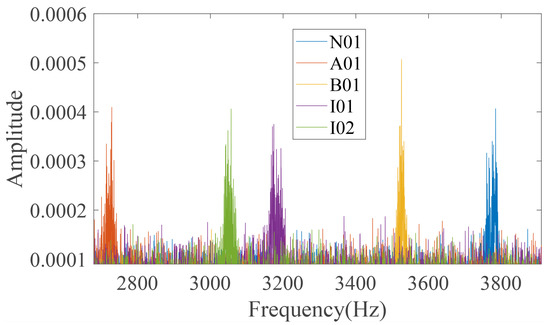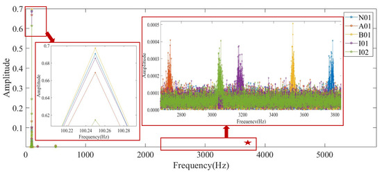 Then, conclude the feature frequency spectrum using FFT transform, as shown in Figure 9. The sample frequency is 64 kHz and the sample length is 256,000. In Figure 9, it is difficult to distinguish the five health conditions through amplitudes; although, the amplitudes with a low frequency range are high. However, the frequency features of five health conditions are obviously different from each other in the frequency band marked by the red, five pointed star, and the frequency spectrum in this frequency range is sketched in Figure 10. It illustrates that there must be obvious frequency difference information of the five health condition signals in a certain unique frequency range; although, their amplitudes are very low and similar. The frequency bands with distinct fault characteristics for , , , , and are described as , , , , and .