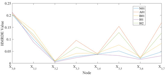 In the real application of HMRDE, there are five parameters that need to be determined. Because the low-frequency smoothing operation in HMRDE can be regarded as an MRDE calculation with scale, for example, entropy values of of HMRDE are equal to MRDE values of X with scale , the scale of HMRDE should not be larger. Because the obvious difference information exists in Hz from these two figures, layer k cannot be selected too large; usually, it is set as 2–6. The embedding dimension m and the number of classes c can be 3 and 5, respectively, and the time delay is 1. For more information about the parameters m, c, and , please refer to the literature [22,24]. Assume the embedding dimension m is 3, the time delay is 1, the scale factor s is 1, the layer k is 3, and the class number c is 5. Then, calculate the HMRDE of the five health condition data. The node entropy values of a time series under five bearing conditions are shown in Figure 11. In Figure 11, node and of five health conditions are more easily distinguished than node , , , and , which explains that the obvious difference information of the dataset exists in some unique higher frequency ranges rather than low frequency ranges.