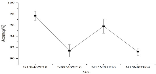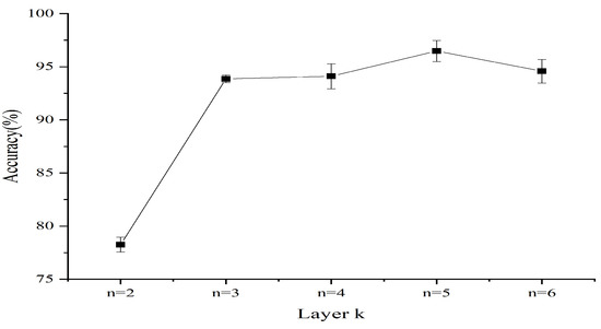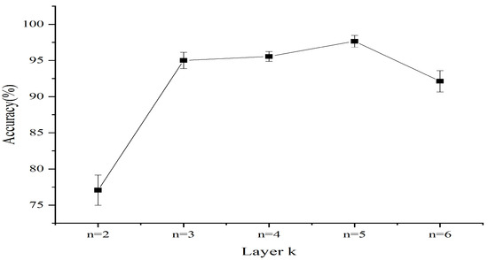 Experiments for each setting are repeated five times. The influence of the selected layer k on recognition accuracy of classifiers is shown in Figure 12, which depicts the highest recognition accuracy of eight classifiers in the training phase. In the training phase, when , the incipient fault recognition accuracy is on average %, %, %, %, and %. Therefore, the layer k of HMRDE can be 5 for these five health condition signals.