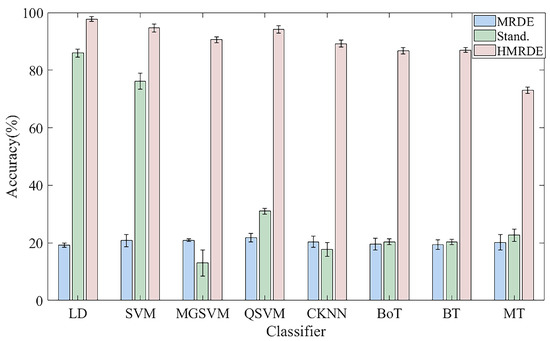 Assume the inputs treated with HMRDE, MRDE, and the standardization method are named ’HMRDE data’, ’MRDE data’, and ’Stand. data’, respectively. Here, standardization method refers to the zero-mean normalization method. The classification accuracy of these classifiers for ’HMRDE data’, ’MRDE data’, and ’Stand. data’ is summarized in Figure 16. Experiments for data with different treatments are repeated five times. In Figure 16, the best average accuracy of the selected classifier for ’Stand. data’ is 85.9% and that for ’HMRDE data’ is 97.7%. Compared with ’Stand. data’, the accuracy of all classifiers for data treated with HMRDE is increased by 11.8%, 17.6%, 77.7%, 63.5%, 76.6%, 64.1%, 65.3%, and 48.9%, and it is increased by 79.5%, 74.1%, 69.5%, 72.9%, 70.0%, 69.5%, and 53% compared to ’MRDE data’, whose classifier classification accuracy is 21.1%.