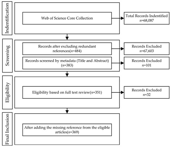 Final Inclusion Stage: The purpose of this stage was to increase the effectiveness of research. By traversing the references of the above articles, 18 articles related to research issues were added. Therefore, 369 articles were finally retained for subsequent analysis.