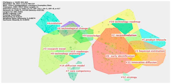 To address RQ1, we used CiteSpace [25] software to conduct cluster analysis on TF-related articles data and obtained Figure 2. There were 1566 nodes and 14,158 lines in the TF sample literature network during the study period. The network density was 0.0116, and the weighted mean silhouette was 0.8874, indicating that the clustering contour was good, the clustering keywords were closely linked, and the clustering results were reasonable. Fifteen clustering topics were obtained based on keywords.