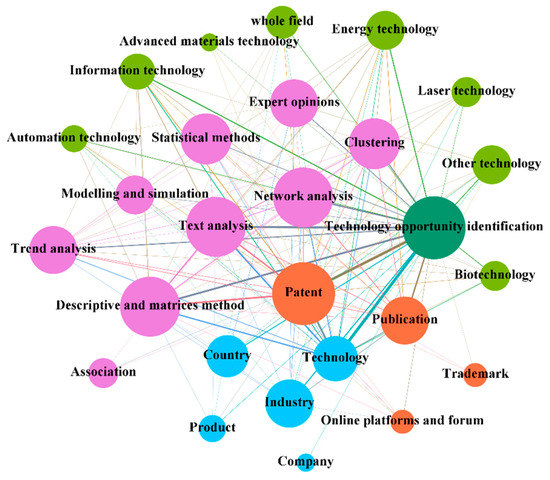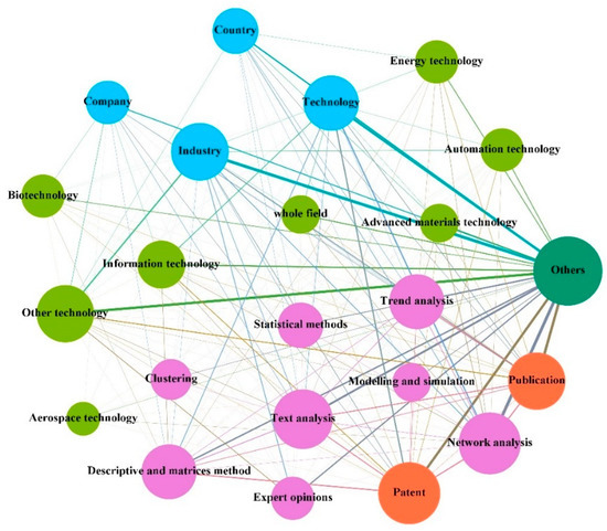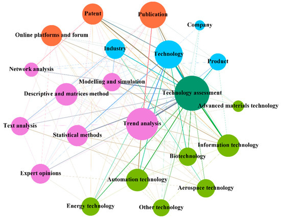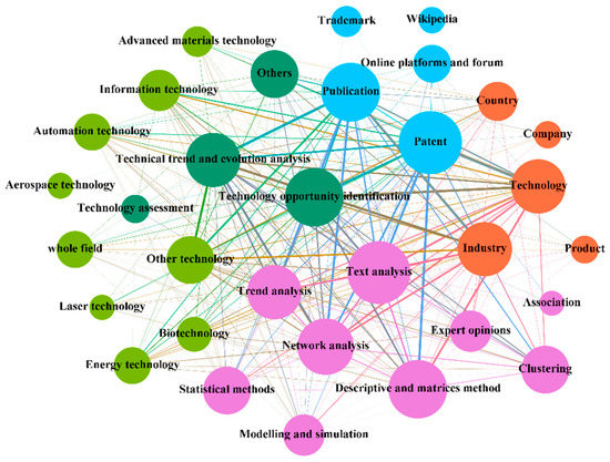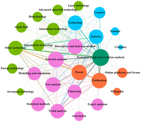 The qualitative content analysis ran through the whole process of this analysis to make up for the limitations of quantitative analysis. Considering that there are many tools and methods involved in the TF system, we drew on existing research [4,24] and divided these models and methods into nine categories according to their purposes and mechanisms. (i.e., expert opinions, trend analysis, text analysis, statistical methods, modelling and simulation, network analysis, clustering, association, descriptive and matrices). This paper also analyzes the complex system in each context, and these phenomena show the interactions between agents in the TF system. The results are visualized by the network. In each network, nodes and links represent the contexts, agents, and their interactions. Specifically, nodes with different colors represent different agents. The size of a node represents the frequency of corresponding elements in the dataset. The strength of the interlinking lines represents the frequency of joint occurrence of nodes.