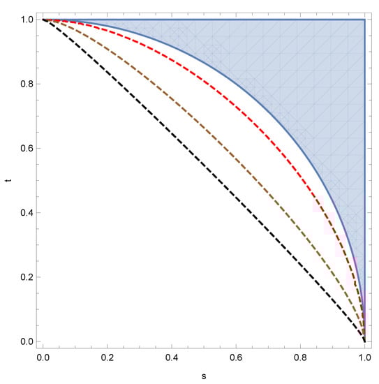 Comparing the incompatibility criterion from Proposition 4 (filled region) with the incompatibility thresholds from Equation (5) (dashed curves) for different values of d: (red curve), (brown curve), (black curve).