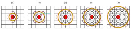 Sites in various neighborhoods on a square lattice. (a) Von Neumann’s neighborhood (, ); (b) Moore’s neighborhood (, ); (c) neighborhood with sites up to the third coordination zone (, ); (d) neighborhood with sites up to the fourth coordination zone (, ); (e) neighborhood with sites up to the fifth coordination zone (, ).