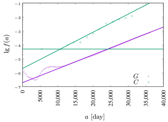 where a is the agent’s age expressed in days. The data follow Gompertz’s exponential law of mortality [46,49].