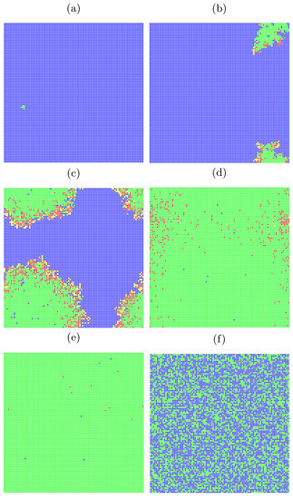 In Figure 3 snapshots from a single-run simulation are presented. They give a quantitative picture of the influence of the interaction range (neighborhood radius) on the spread of the disease. The snapshots in Figure 3a–e show the situation for fixed parameters and at the time step, which corresponds to five months after introducing (at random site) ‘Patient Zero’. The last subfigure (Figure 3f) presents a situation after a very long time of simulations ( 20,000) where the recovered agents die due to their age (according to Equation (5)) and are subsequently replaced by newly born children. For the interaction limited to the first coordination zone (Figure 1a) the disease propagation stays limited to the nearest neighbors of ‘Patient Zero’. On the other hand, for the neighborhood with sites up to the fifth coordination zone (Figure 1e) for the same infection rates ( and ) the disease affects all agents in the population (see Figure 3e). The direct evolution of the system based on [51] can be simulated and observed with the JavaScript application available at [52].