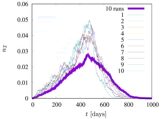 In Figure 4 the fraction of infected agents (in state ) is presented. The figure shows the results of ten different simulations for values of the neighborhood radius , , . In addition, the results of averaging over simulations are presented. In two out of ten cases, the epidemic died out right after the start, while in the remaining eight cases it lasted from about eight hundred to over a thousand time steps (days). The figure also shows that the averaging of the results allows for a significant smoothing of the curves, which fluctuate strongly for individual simulations. Based on this test (for (not shown) roughly doubly large statistics, , which do not reveal significant deviations), we decided to average our results (presented in Figure 5, Figure 6 and Figure 7) over ten independent simulations.