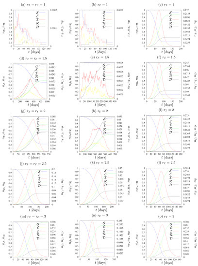 In the left column of Figure 6 the dynamics of states fractions n for various values of the radius of the neighborhood are presented. We assume , . As we still keep , setting simulates the fact that exposed agents (who are not aware of their infection) are more dangerous to those around them than those who know that they are sick, and therefore avoid contact if they show severe symptoms of the disease.