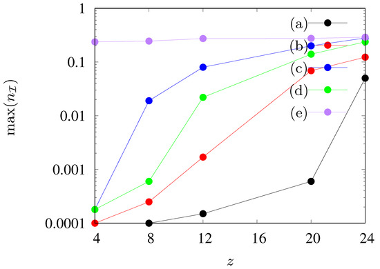 Maximal fraction of agents in state as dependent on the number of agents’ neighbours z in the neighborhood. (a) , , (b) , , (c) , , , (d) , , , , (e) , , , .