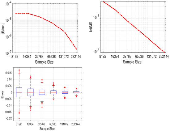 In the following section, we compare the Monte Carlo sampling method to approximate the KLD value with the numerical value of the closed-form expression of the latter. The Monte Carlo method involves sampling a large number of samples and using them to calculate the sum rather than the integral. Here, for each sample size, the experiment is repeated 2000 times. The elements of and are given in Table 3. Figure 1 depicts the absolute value of bias, mean square error (MSE) and box plot of the difference between the symmetric KL approximated value and its theoretical one, given versus the sample sizes. As the sample size increases, the bias and the MSE decrease. Accordingly, the approximated value will be very close to the theoretical KLD when the number of samples is very large. The computation time of the proposed approximation and the classical Monte Carlo sampling method are recorded using Matlab on a 1.6 GHz processor with 16 GB of memory. For the proposed numerical approximation, the computation time is evaluated to 1.56 s with . The value of N can be increased to further improve the accuracy, but it will increase the computation time. For the Monte Carlo sampling method, the mean time values at sample sizes of {65,536; 131,072; 262,144} are seconds, respectively.
