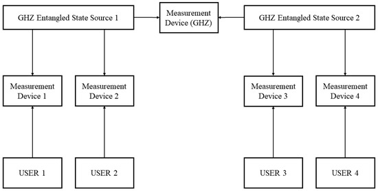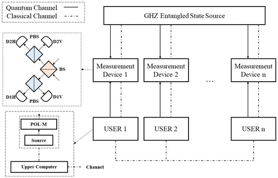 In this section, we analyze the generation of the secure key. The key generation in the Z basis in our protocol can be equivalent to the construction shown in Figure A1. The GHZ entangled source distributes a particle of the n-particle GHZ entangled states to each user. Users measure the polarization of the particle and obtain the secure key.