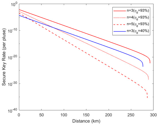 Secure key rate with single-photon state. The red line corresponds to the detection efficiency of [24], and the blue line corresponds to the detection efficiency of [23]. n is the number of communication users. The distance refers to the length of the quantum channel between any user and the measurement device.