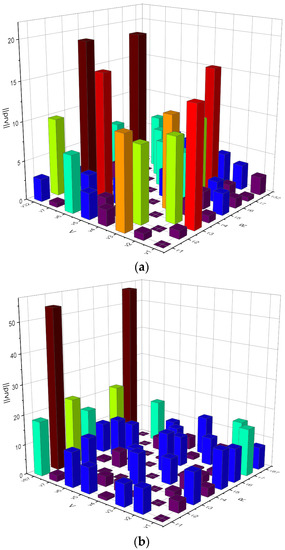 Figure 1 visualizes fragments of the resulting matrices for person №1, calculated with the selected hard (Figure 1a) and soft (Figure 1b) sets of formation conditions. The capacities of the phonetic alphabets were and language units, respectively. The minimum value of information discrepancy between phonemes was .