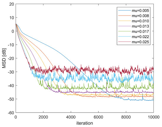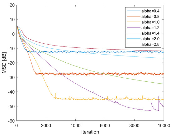 Second, the stability of GMCCC-AIIR at different step sizes is investigated. Figure 3 shows the convergence performance for different step sizes. The noise is still the mixed Gaussian noise and . The simulation results show that when the step size is large, such as , the convergence performance gets worse, and the GMCCC-AIIR will diverge if step size continues to increase, which confirms the correctness of the stability analysis in Section 4.