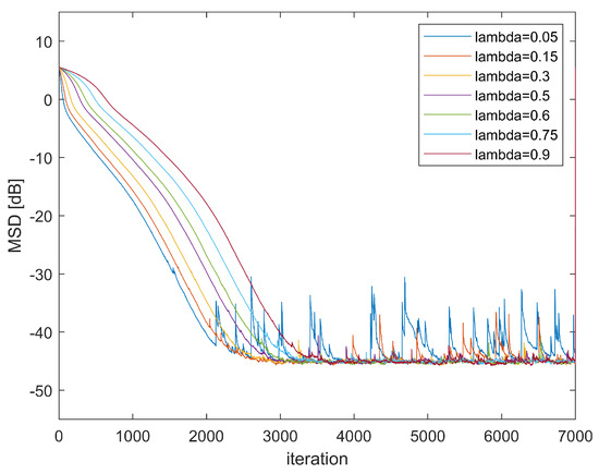 Third, we introduce how the parameter will affect the performance of the algorithm. Figure 3 shows the learning curve of GMCCC-AIIR with different . The noise is mixed Gaussian noise and . We can see from Figure 4 that when the parameter increases, the convergence speed will slow down. However, when is too small, the GMCCC-AIIR algorithm is approximate to the ACA-IIR, and the convergence performance is poor in the non-Gaussian noise model. Therefore, we should choose the appropriate parameter according to different situations.