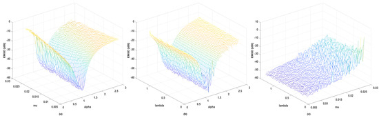 Fourth, we introduce how pairwise parameters , , and affect the steady-state excess MSD (EMSD) and give 3D diagrams of EMSD. The number of iterations is increased to 15,000 to ensure the convergence of the algorithm, and the additive noise is still mixed Gaussian noise. EMSD equals the average MSD of the last 1000 iterations. Figure 5 shows that EMSD of GMCCC-AIIR mainly depends on and . The performance of the algorithm get worse when increases and approaches 1, the algorithm performs best. Combined with Figure 4 and Figure 5b,c, mainly affects the convergence speed of the GMCCC. When approaches 0, the robustness of the algorithm to non-Gaussian noise gets worse, the outliers of EMSD increase, and the algorithm may even diverge.