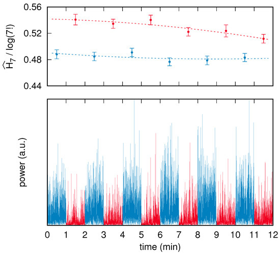 Figure 4, all data points corresponding to the eyes-closed condition have a PE value that is significantly lower than any point of the eyes-opened condition. The closest pair is given by the eyes-closed segment in the time range between 4 min and 5 min (third blue point from left), and the last, eyes-opened segment in the time range between 11 min and 12 min (sixth red point from left). The PE values of the two points are