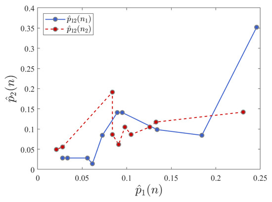 As an example of this, consider the changing probability distributions in a synthetic language sequence. In this case, audio conversation files are transformed into synthetic languages based on an alphabet size of 10 symbols, using the pause lengths between speech audio activity [31,50]. A visualization of the trajectories of changes in probability distributions computed from sequences of natural conversational data is shown in Figure 2. In this particular case, we consider only two of the probability mass points, where indicates the probability located at the trajectory point at time Hence, this enables the comparison of corresponding points in probability trajectory space over time. Our task is then to determine a more comprehensive probabilistic model of the underlying behavior that gives rise to the observed probabilistic changes.