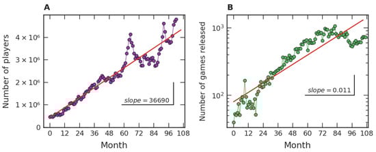 Our empirical results about the popularity of video games, based on one of the major gaming platforms (Steam), suggest a robust scenario. Firstly, our studies are consistent with the notion of a crescent number of video game players around the world, as well as with an increase in video games released over time. Quantitatively, the average number of players per hour along the months approximately displays a linear growth, which is manifested both from a global point of view (Figure 1A) and from the perspective of game categories (Figure 5A), especially for the major ones. For the number of distinct categories, a pattern of growth similar to the ones presented in Figure 1B and Figure 5B was also verified in Figure 7A. As for the evolution of the number of released games, an approximately exponential growth trend was identified at the global level (Figure 1B). This behavior of linear (arithmetic) resource growth and exponential (geometric) demand has already been well explored by Malthus []. Indeed, players will occupy the role of resources and games and the role of demand in the Malthusian view if we interpret games as competing with each other for players’ attention. In this case, the exponential increase drastically dominates the linear one in the long term. In addition to Figure 1A,B, a Malthusian pattern of growth is also present when analyzing the data in categories (Figure 5A,B), but less robust. These studies point to common patterns of growth in the three levels under investigation: global data, major categories, and among categories. The Malthusian behavior is common in population dynamics in biological [] and social [] systems when there are no limitations, typically occurring in the early stages. On the other hand, restrictions to this initial growth regime commonly manifest over time, indicating some kind of population saturation [].