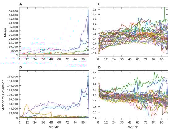 where represents the average number of players by the hour in each month in the i-th game and log refers to the logarithm in base e. Using this new variable, we in fact verified an improvement in the temporal behavior of the means and the standard deviations, in the sense of revealing a more constant behavior after the first months after the game’s release. This fact is illustrated in Figure 2C,D.