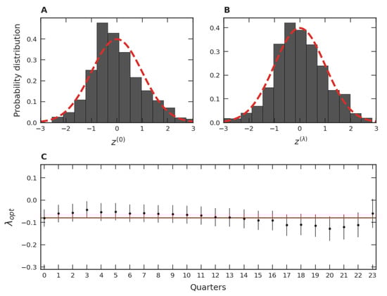Despite our grouping of the twenty-four quarters of the time evolution for the trimester data, it should be noted that we can apply the Box–Cox transformation separately for each of these quarters. The results of these applications are PDFs comparable to the one presented in Figure 3B. In addition, the optimal for each one of these PDFs is close to the considered in Figure 3B, as presented in Figure 3C. Similar results were verified for each optimal value of the other thirty-three trimesters of our data. These results indicate that the PDFs of each one of the thirty-four trimester groups are both stable and similar to each other over time, justifying the use of the grouping process employed in Figure 3A,B.