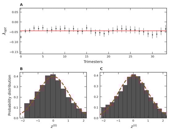 Box–Cox analysis for all trimester groups. (A) Optimal , , for each trimester group (disc) and the mean value, , represented by the red straight line. The error bars indicate confidence intervals. (B) For the normalized global data, the PDF of the logarithmic variable, . (C) The same as in (B) but employing in the Box–Cox transformation. The dashed lines correspond to the normal distribution with mean zero and unity standard deviation.