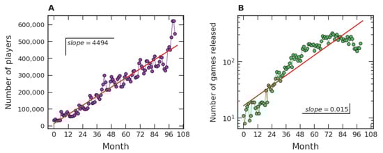 Number of players in and of games released on Steam for the Indie category. (A) The average number of players per hour in each month for the Indie category (purple discs) and a linear adjustment (straight line, red), where month one is July 2012 and the last month is December 2020. (B) During these same months, growth of the number of games released in this category (green discs) and an exponential fit (straight line, red).