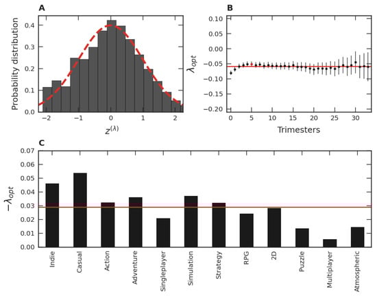 Video game categories. (A) PDF for the Indie category obtained via the Box–Cox transformation (), analogous to Figure 4C (all quarters of all trimester groups together). (B) The Box–Cox parameter for Indie games in each trimester of our dataset, analogous to Figure 4A. The bars refer to confidence intervals. The straight line refers to the mean of all trimestral Box–Cox parameters, . (C) Optimal Box–Cox parameter, , for the twelve largest game categories, calculated via the same procedure of (A). The ’s are sorted in descending order of their number of games by category. The straight line represents the average of these ’s, for the twelve major categories.