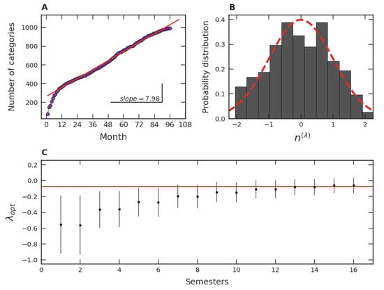 Distribution of video game categories. (A) Time evolution of the number of categories along the months from July 2012 to December 2020. The straight red line represents a linear adjustment from month 10 to the last one. (B) PDF for categories obtained via the Box–Cox transformation () as a function of the number of video games in each category in December 2020. The dashed line refers to a Gaussian distribution of mean zero and unity standard deviation. (C) Time evolution from 2012 to 2020 of the , where each disc represents a semester. The bars indicate confidence intervals of parameters. The straight red line exhibits the mean behavior of the last two years.