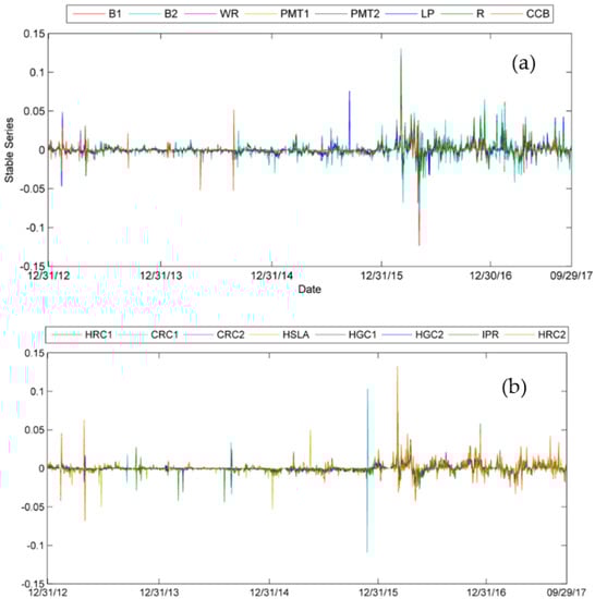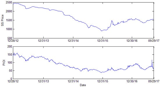 The Platts iron ore index uses the spot price, which is based on 62% Fe iron ore CFR (cost and freight) prices of the Qingdao steel market, a major China steel market. The spot price can better reflect the fluctuation tendency of the iron ore index and is widely used by steel market individuals, such as steel-making companies, traders, and mining companies. In June 2013, the PIOI index reached its lowest point (110.75) in 2013 and then climbed to 142.5 on 14 August. Subsequently, the PIOI index fluctuated to decrease until it reached the lowest point (38.5) in the sample period on 15 December 2015. In 2016, iron ore trading began to recover, and during the whole year, the PIOI index increased slowly except for the period from 21 April (70.5) to 9 May (54.85) and the period from 23 August (62.5) to 20 September (55.1). In 2017, the rising tendency continued until 21 February (95.05). Then, there is a sharp decline from 21 February (95.05) to 13 June (54). Then, the index increased, and on 7 September, there was a dramatic increase. The index was up to 116. Then, the PIOI fluctuated and fell.