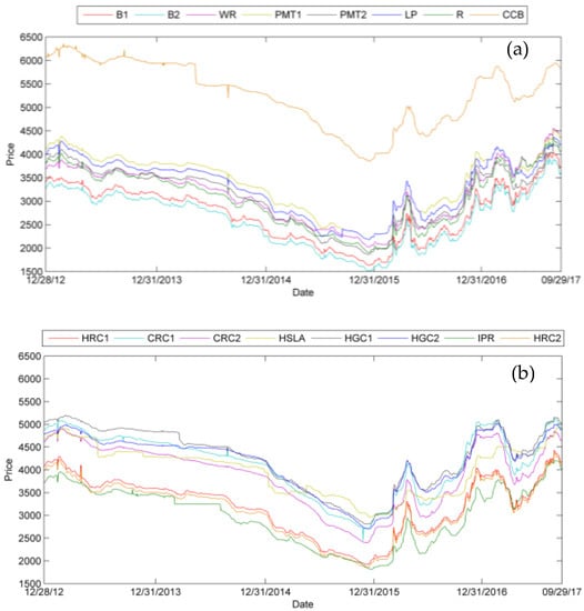 Figure 2a,b show different steel product price fluctuation trends. Overall, the price variation represents a similar trend to steel material variation. Namely, from 2013, steel demand decreases. Environment regulation activity curtails industry production, and cutting-capacity activity eliminates backward steel capacity. The whole industry goes into a downturn. Until 2016, when the industry regulation in the past few years came into effect, the external economic environment also improved to a stable level, and the steel product price started to rebound. Prior to 2016, infrastructure construction was put into practice and reducing steel inventories pushed steel prices to grow. Steel product price growth gave the market individual confidence about market recovery, and this confidence accelerated the price surge again. However, these short-term soars lacked stable market fundamentals, and product prices tumbled considerably to a reasonable range. Then, the steel product price gradually increased as domestic and foreign demand recovered. In 2017, the real estate market was ambiguous, and it decreased the downstream demand. Additionally, this year, China struggled to eliminate substandard steel. Regulation improves the product quality and increases the enterprise profits. Therefore, there was a down and uptrend in 2017.