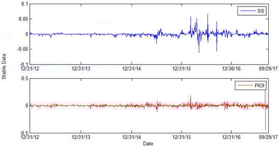 Figure 3, the blue line of SS represents the log return series of scrap steel. The red PIOI line represents the log return series of Platts iron ore index. The price of steel scrap fluctuates severely in the midterm of 2015 and the year 2016. The variation tendency of the Platts iron ore index is moderate. However, in the midterm of 2015 and early 2016, the index fluctuates a lot. In